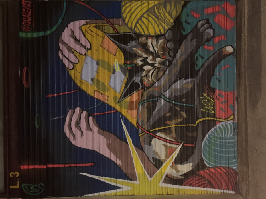 Graffiti-style mural depicts a cat amidst yarn balls, tangled in strings