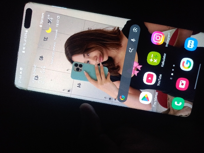 A smartphone screen displays a calendar-like interface with the date, "Jum 6-fevral," and the time "21:44." The screen also shows location information, "Ургенч," and weather details. Overlaid on this is a partial view of another picture containing app icons like Instagram, YouTube, Play Market, and Kalkulator. A search bar is visible on the side of the screen. The phone's battery level is at 63%.