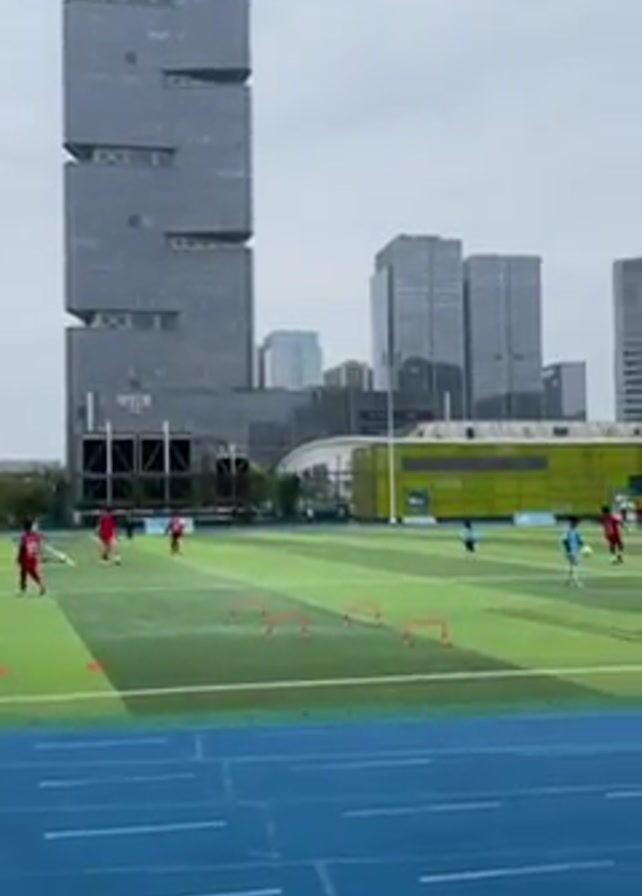 The camera pans across a green soccer field with several children and adults in view. The children are participating in a soccer practice, while the adults appear to be observing or coaching. The field is surrounded by a blue running track. In the background, there are several modern buildings of varying heights. A man in a white shirt and dark pants is running along the blue track toward the right side of the video. The sky is overcast.