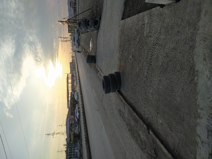 The image depicts a wide, two-lane asphalt road traversing an urban or semi-urban area in Bukhara, Uzbekistan, under a bright, low sun on the horizon, suggesting either sunrise or sunset. The sky is partially cloudy, with a luminous glow emanating from the sun. In the immediate foreground, a rough concrete surface transitions to a dirt and gravel shoulder. A stack of four black tires is centrally placed on this concrete slab. Further along the right side of the road, another large stack of black tires is propped against a lean-to structure or fence, which is partially obscured by a large sign displaying Cyrillic script. Small puddles of water are visible on the uneven ground near these tires. The main asphalt road features a low concrete median separating the two directions of travel. Multiple vehicles, predominantly cars, are scattered along both sides of the road; some appear to be in motion, while others are parked. A noticeable amount of dust or haze hangs in the air above the road surface, particularly on the far side. One individual is observed walking on the right shoulder of the road, moving away from the viewer in the mid-distance. Along the left side of the road, a series of commercial buildings, some with modern architecture or appearing to be under construction (one shows exposed structural framework), line the street. Several vehicles are parked parallel to these structures. In the background on the left, large metal lattice power transmission towers are visible against the skyline, with utility lines crisscrossing overhead.