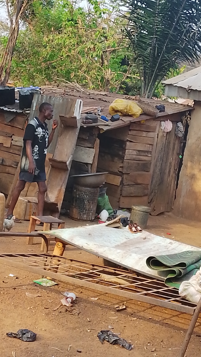 An impoverished outdoor scene showcases a man, wearing a printed t-shirt and shorts, stepping down from a wooden structure. His backdrop consists of a makeshift dwelling constructed from wooden planks and corrugated metal. In the foreground, a metal bed frame lies on the dirt ground, with a mattress on top. Clutter, including trash, a green mat, and a pair of sandals, litters the unkempt yard. Trees are visible in the background.