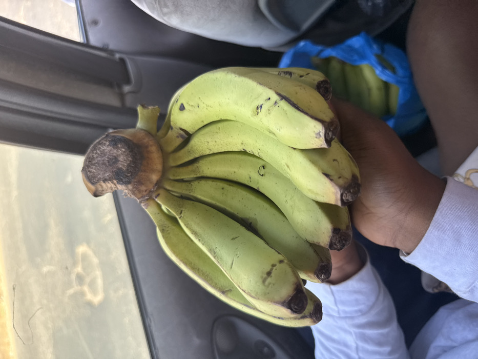 - "A close-up image taken in Kuru Dungus, Nigeria, depicts a human hand holding a large cluster of approximately ten to twelve unripe green bananas with visible dark brown stems and some surface blemishes" by FM-drzm52, licensed under CC BY 4.0