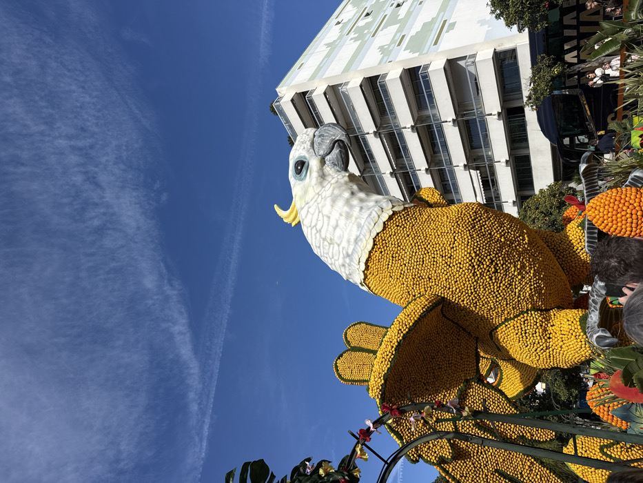 - "The image depicts a large, elaborate parade float featuring a stylized parrot figure, situated outdoors in Menton, France, under a clear blue sky with visible white contrails" by FM-CYJaF3, licensed under CC BY 4.0