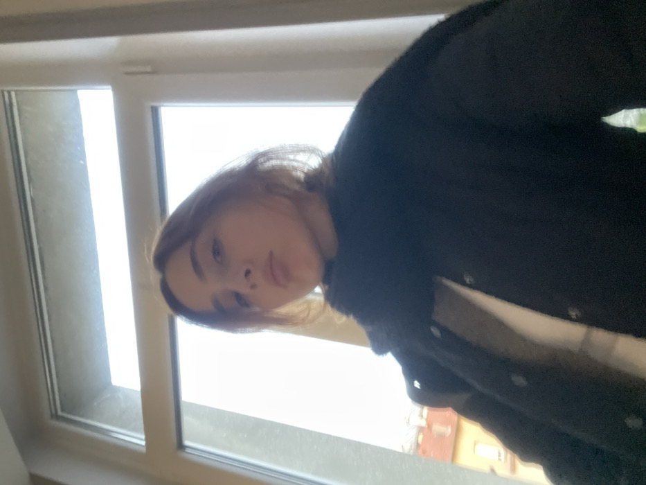 A female individual is photographed from a low angle, standing indoors before a multi-pane window in the city of Reims, France