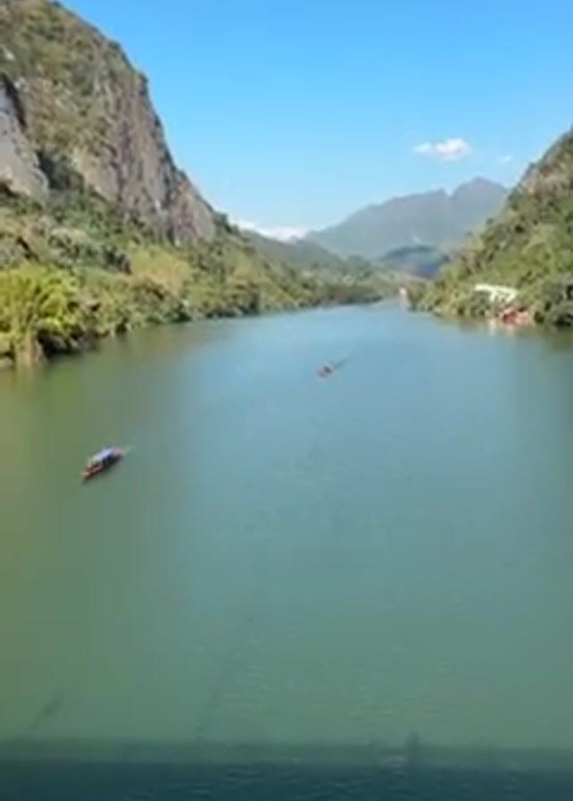 wide river or lake, surrounded by steep, rocky, green hills and mountains under a clear blue sky. Two boats are visible on the water, one closer to the left side of the frame and another further in the distance near the center. The water is a greenish-blue color. The scene appears to be captured from a high vantage point, possibly a bridge.