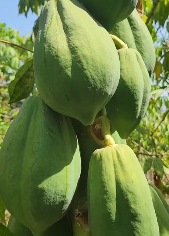 - "close-up view of several unripe, green papayas hanging from a papaya tree" by FM-m6iwH3, licensed under CC BY 4.0