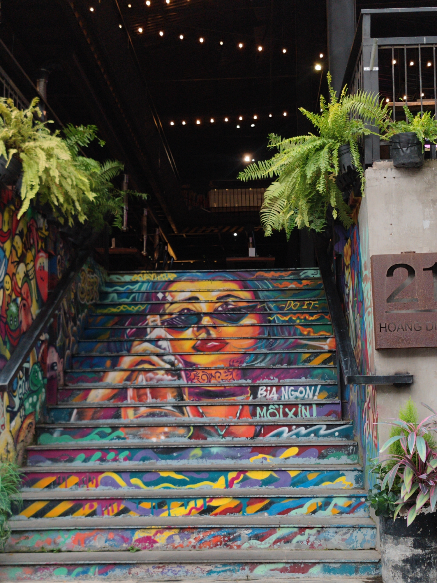 The image depicts a set of stairs leading to a building entrance. The stairs are painted with a vibrant mural featuring a woman with sunglasses and graffiti-style lettering. The walls alongside the stairs are covered in graffiti. The entrance is indicated by a sign that reads "21 Hoang Dieu" which is a street in Cam Ly - Đà Lạt, Vietnam. Hanging plants are placed on the sides of the stairs and on a balcony above. String lights are strung across the opening above the stairs, creating a dimly lit atmosphere. The scene appears to be taken during the daytime.