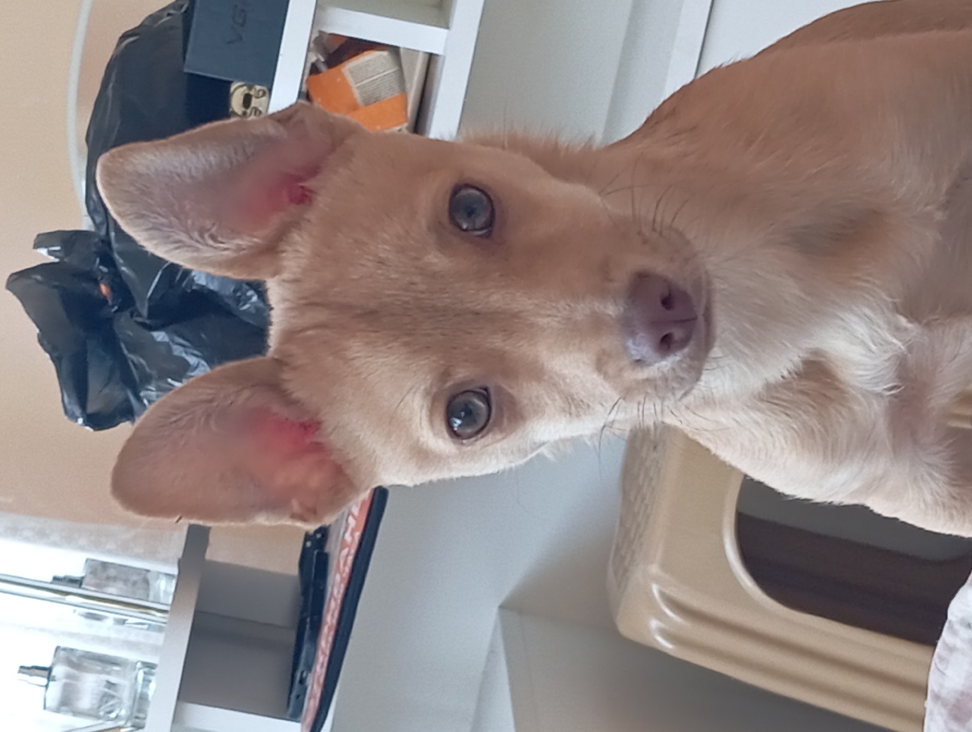 A tan dog with erect ears is looking directly at the viewer. The dog's eyes are gray, and its nose is pink. The dog appears to be indoors, near a white shelf with a black plastic bag and other items. A tan-colored object is to the dog's right. The location and city of Vidin, Bulgaria, are not visually confirmed in the image.