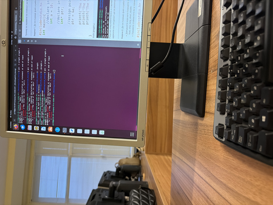 The scene depicts a computer workstation in what appears to be an educational or office environment in Burgas, Bulgaria. The foreground features a dark-colored keyboard with both Latin (QWERTY) and Cyrillic character overlays, indicating a Bulgarian locale. Directly behind the keyboard is a light-brown wooden desk surface. A silver-bezeled HP LP2065 monitor dominates the central view, displaying an Ubuntu Linux desktop interface. On the left half of the screen, a terminal window (likely Gnome Terminal) shows `bash` commands and `gcc` compilation attempts for a C program named `progS1.c` located in `/Desktop/s1t0_Georgi/`. The terminal output includes compilation errors ("expected declaration or statement at end of input") and successful program execution displaying "The value is: 10" and "The value of ptr is: [hexadecimal address]". The right half of the monitor shows a text editor or IDE displaying C source code, including standard library includes (`#include <stdio.h>`), a `main` function, integer and pointer variable declarations (`int a = 10;`, `int *ptr;`), pointer assignment (`ptr = &a;`), and `printf` statements for displaying values. The system clock in the top right corner indicates "23 Mar 17:35". The background, out of focus, reveals additional computer monitors and equipment on similar wooden desks, suggesting multiple workstations. A window with horizontal blinds is visible in the far background, admitting natural light from outdoors. Partially visible objects on the left side of the desk include a dark, textured bag and a dark water bottle. No individuals are directly visible in the frame, but the setup implies active use by a programmer or student.