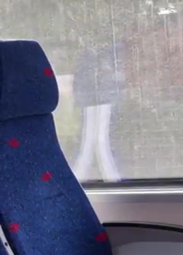 The view from the window of a moving train shows an outside scene, with a blue seat with red markings in the foreground.