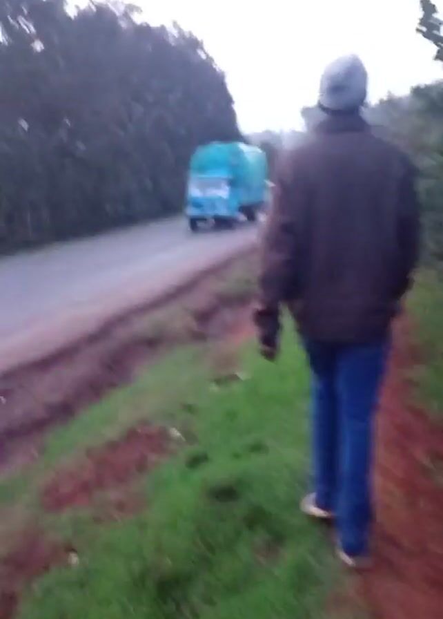 person walking on a dirt path next to a road. The person is wearing a dark jacket, blue jeans, and a hat. The road has a few vehicles driving on it, including a blue truck with a green tarp covering its cargo. The path is bordered by green grass on one side and a small cliff leading down to the road on the other. There are trees in the background. The sky is overcast, and the light is dim.