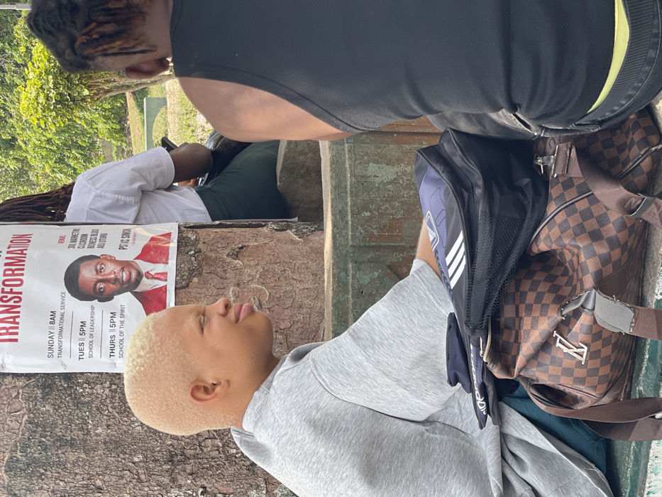 The image depicts an outdoor or semi-outdoor scene in Uturu, Nigeria, specifically near the Business Block, Abu Uturu, where a "300 Marketing Classroom" is located, as indicated by a poster. In the foreground, three individuals are present. On the left, a person with short, light blonde hair and fair skin is seated in profile, looking towards the right with a slight expression on their face. They are wearing an oversized grey long-sleeved shirt. Resting in front of this individual are two bags: a large, brown, checkerboard-patterned duffel bag with a gold "LV" logo, and a smaller dark blue/black Adidas drawstring bag placed on top of it. To the right, the back of another person is visible, wearing a black tank top and featuring dark hair styled in dreadlocks or braids. A hint of yellow apparel is visible below their waistline. In the mid-ground, further to the right and slightly behind the first individual, the back of a third person is visible, also with dark dreadlocks/braids, wearing a white short-sleeved shirt and dark green pants. A white poster, largely visible in the upper center, is attached to a textured tree trunk or pillar. The poster, titled "TRANSFORMATION" in red, advertises "Transformational Service" on Sunday at 8 AM, "School of Leadership" on Tuesday at 5 PM, and "School of the Spirit" on Thursday at 5 PM. It features a portrait of a man identified as "PST KC SIMON," depicted in a red suit and tie. The venue is explicitly stated as "300 MARKETING CLASSROOM, BUSINESS BLOCK, ABU UTURU." The ground surface beneath the bags is a worn concrete or stone structure, exhibiting patches of green and grey discoloration. The background features green foliage and trees, illuminated by bright daylight.