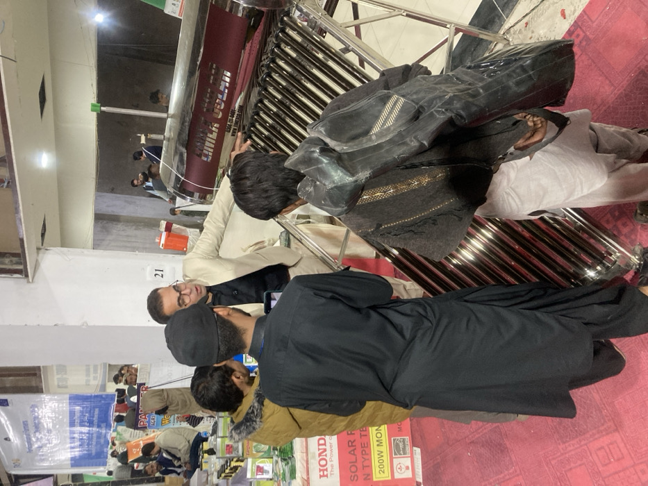 The image displays an indoor exhibition or trade fair event occurring in Quetta City Tehsil, Pakistan