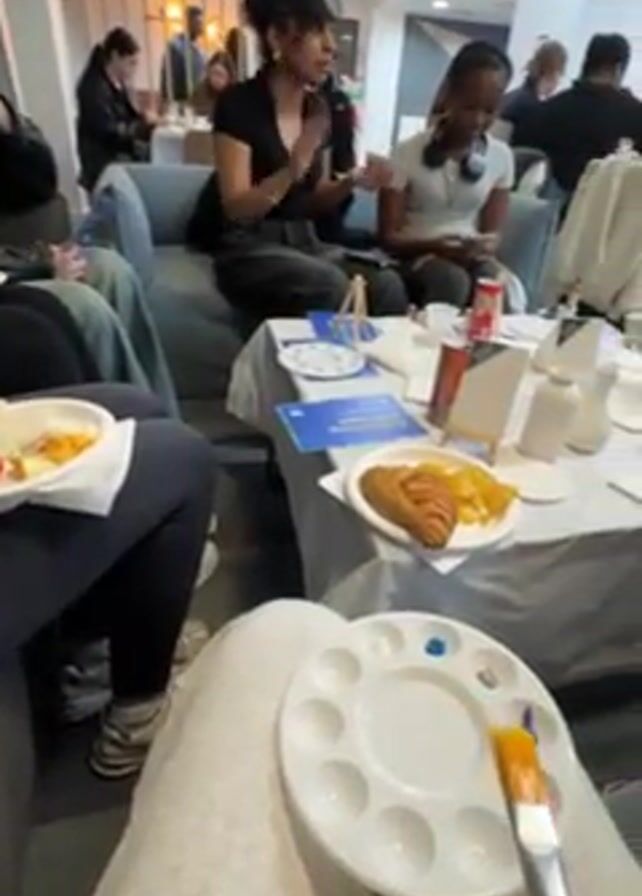 group of people, mostly young adults, gathered at tables for what appears to be a painting event. Several are seated on a grey couch. The focus is on a first-person perspective, showing the viewer holding a white paint palette with small amounts of blue, purple, and red paint, along with a yellow-tipped paintbrush. The viewer is wearing grey sweatpants. The table has a white tablecloth, and there are plates with pastries like croissants and sliced fruit, along with drinks. Another person is painting a pink cylindrical object. The event is indoors, under bright lighting, and there are decorations hanging in the background. There is casual chatter in the background.