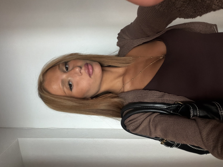 An image depicts a light-skinned female individual posing for a close-up indoor selfie. She possesses long, straight, light brown hair, defined eyeliner, and light pink lip color. Her attire includes a dark brown scoop-neck top, a light brown knit open-front cardigan, and a long gold-colored beaded necklace. A black handbag with distinct white stitching is visible on her left shoulder. The background is a plain white wall with a vertical line, likely a corner or door frame, on the left side of the frame. The precise location within Alicante/Alacant, Spain, cannot be ascertained from the visual evidence presented.