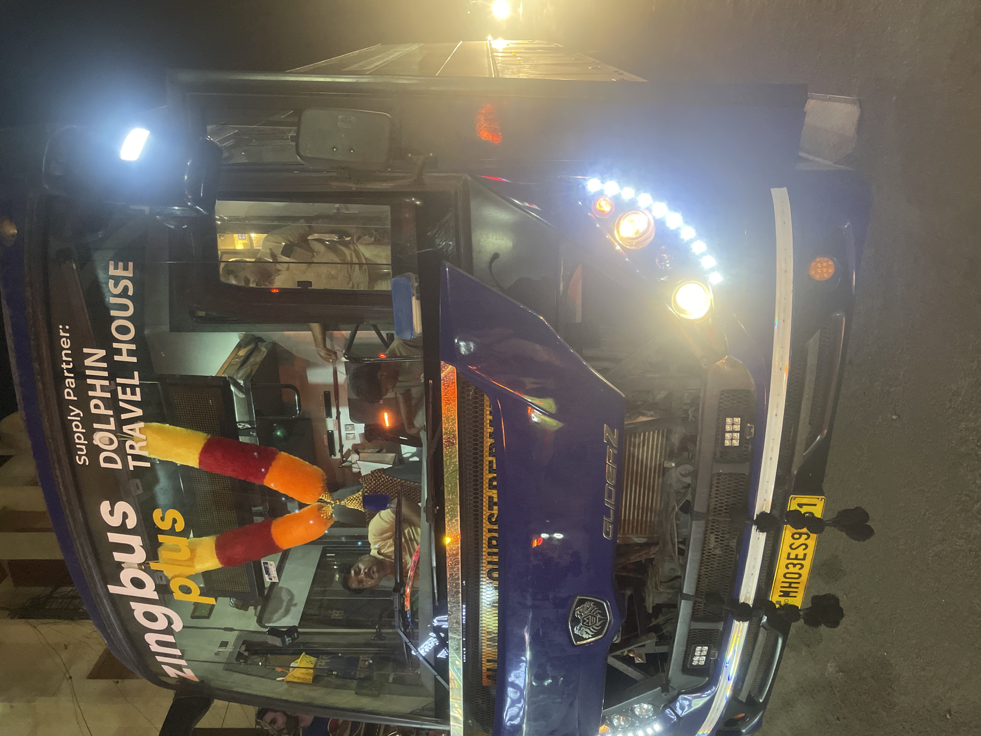 The image captures the front of a Zingbus Plus, a tourist bus, potentially in Kolhapur, India, indicated by the Maharashtra state vehicle registration number "MH03ES9961" on the license plate. "Supply Partner: DOLPHIN TRAVEL HOUSE" is printed on the side of the bus. The bus is decorated with a garland, suggesting a recent event or celebration. Several people are visible inside the bus, possibly passengers and a driver. The environment appears to be a street at night, with streetlights providing illumination. The model of the bus is "GLIDER Z".