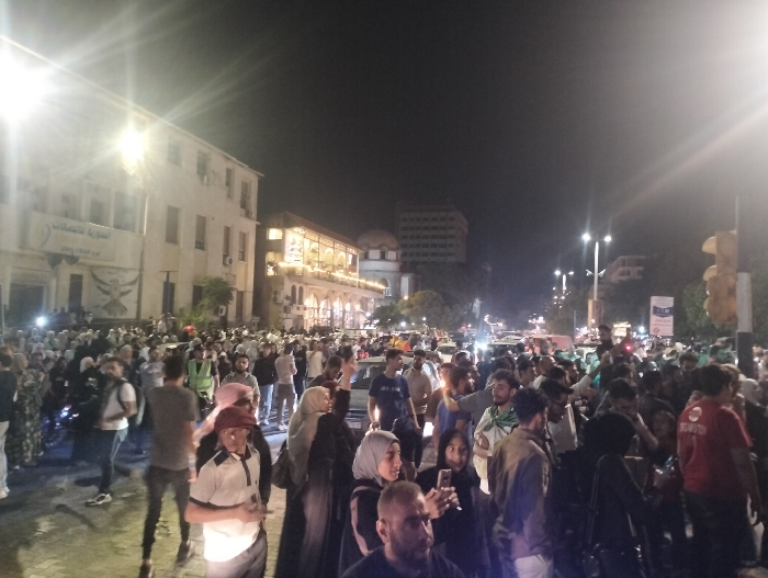 The image captures a densely crowded night scene at Al-Saa'a Al-Jadida (New Clock Tower) Square in Homs, Syria