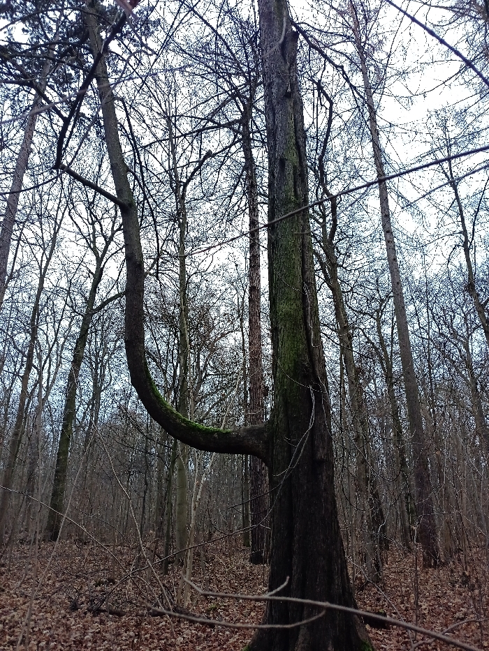 The image displays a dense, deciduous forest environment, characteristic of late autumn or winter, located within the city of Leipzig, Germany. The scene is dominated by numerous bare-branched trees under an overcast sky. In the foreground, positioned to the right of the frame, stands a large tree with dark, rugged bark, extensively covered with patches of vibrant green moss. A thick, prominent branch emerges horizontally from the lower-mid section of this tree, then curves sharply upward in a distinct U-shape, also bearing moss. The left side of the foreground and the midground feature other slender trees with bare branches. The ground is uniformly covered with a thick layer of dry, brown, fallen leaves and scattered bare twigs. No individuals, animals, or man-made structures are present within the frame. The lighting indicates an ambient, cloudy daylight condition.
