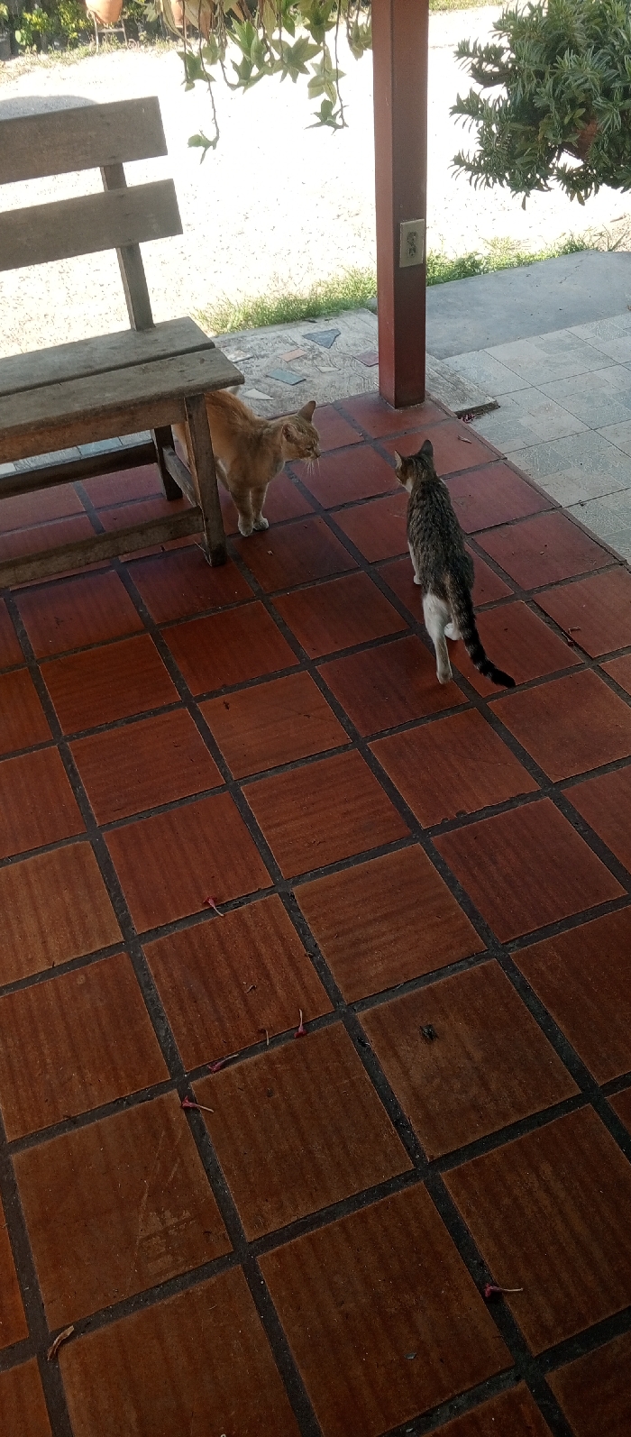 This image depicts an outdoor patio area in Tinaquillo, Venezuela, featuring two domestic cats. The foreground is dominated by a reddish-brown tiled floor with dark grout lines, upon which several small, dried red plant debris are scattered. To the left, a weathered wooden bench with horizontal slats is visible, partially obscuring an orange-colored cat positioned beneath it. This cat is facing right, towards the center of the frame. To the right, a tabby cat, exhibiting grey, brown, and white markings, stands facing left, oriented towards the orange cat. The two felines are approximately one meter apart, appearing to be in an observational or confrontational stance. In the midground, a reddish-brown square column stands on the right, featuring a standard electrical outlet mounted on its visible face. Beyond the tiled area, a concrete path is discernible, bordered by short green grass. The background reveals additional green foliage, with leaves hanging from above the frame. The scene is illuminated by natural light, casting distinct shadows on the tiled surface. No human subjects are present.