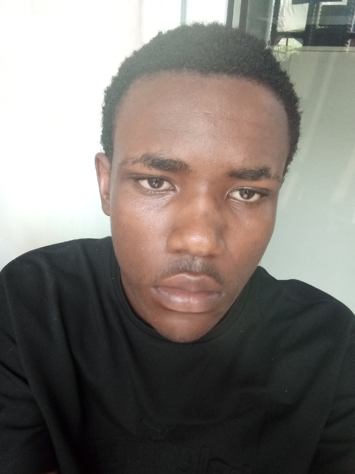 A close-up portrait shows a young adult male with dark skin and short, kinky black hair