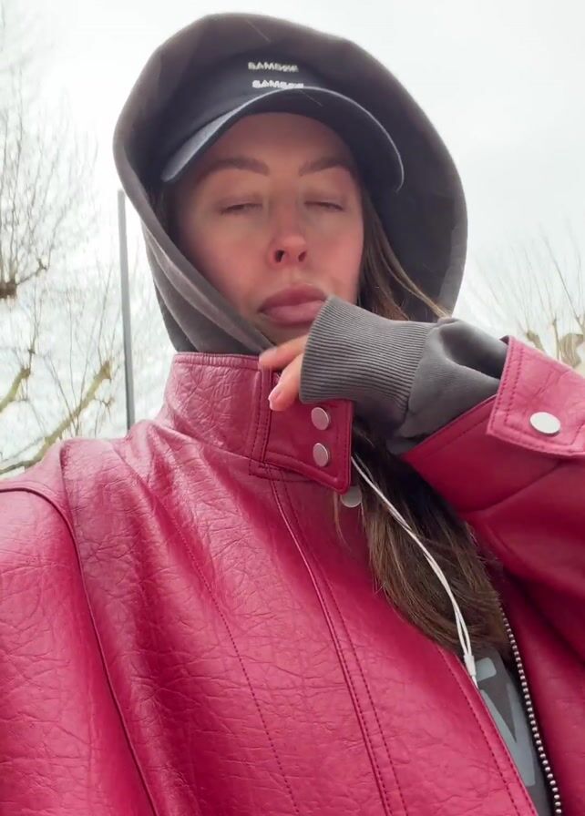 A person is walking on a sidewalk on a cloudy day. The person is wearing a red jacket, a gray hoodie, a black cap, and white earbuds. The person is looking at the camera and adjusting their jacket. There are buildings, trees, a street, and vehicles in the background.