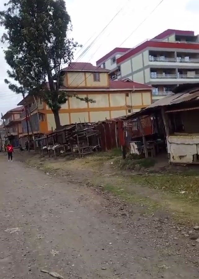dirt road lined with dilapidated structures, possibly market stalls, on one side, and a taller, modern building in the background