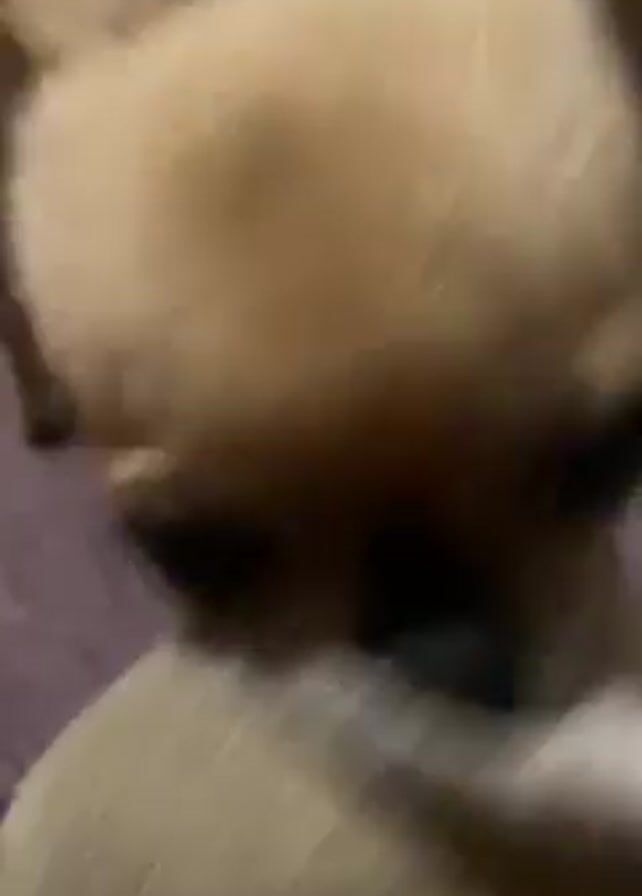 A tan Chihuahua is seen on a bed with purple bedding. A hand holds a grey stuffed animal in front of the dog, which proceeds to bite, nibble, and shake the toy. The dog’s ears are perked up during this interaction. The hand holding the stuffed animal moves it around, engaging the dog. The stuffed animal appears to be shaped like a quadruped. At one point the hand briefly appears to have a tattoo on it.