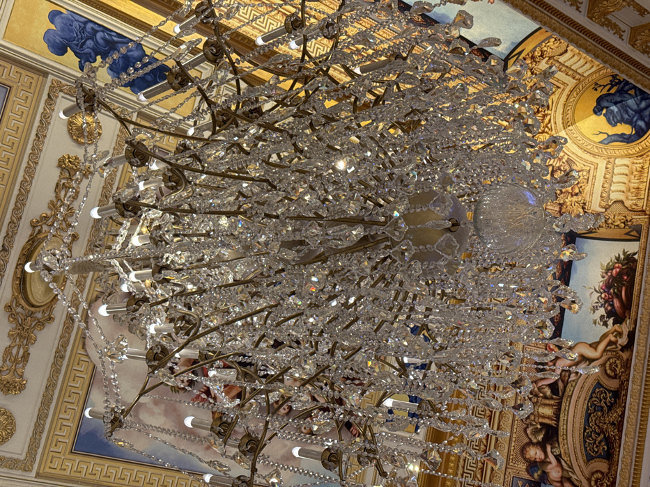 - "A large, multi-tiered crystal chandelier, featuring numerous illuminated candle-shaped bulbs on gold-toned metal arms, hangs centrally within an opulent interior in Unknown, Macao" by FM-7eaFY2, licensed under CC BY 4.0