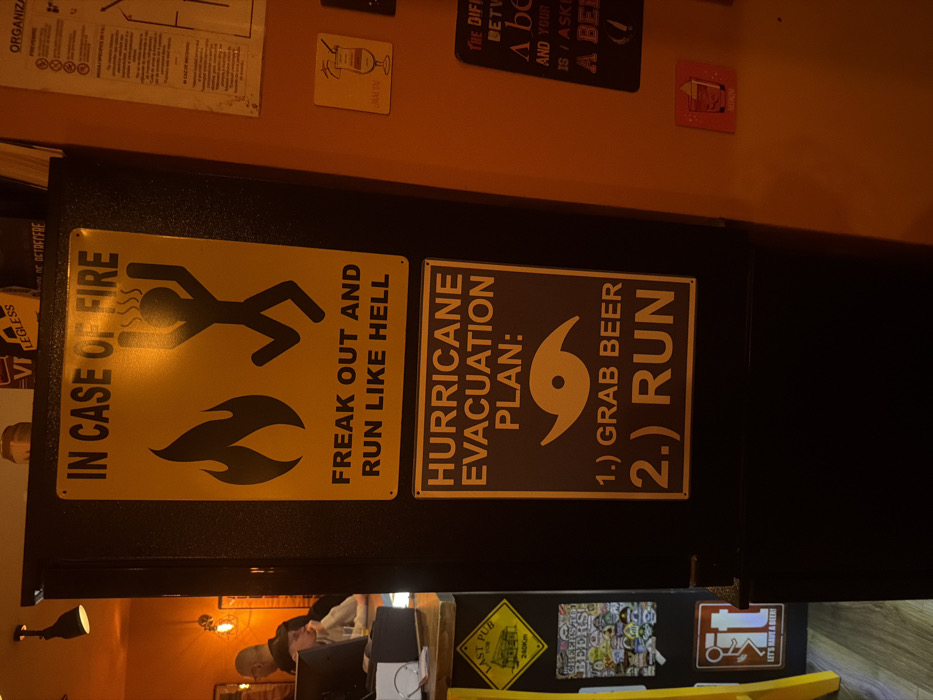 This image depicts the interior of a commercial establishment, specifically a pub or bar named "Last Pub," located in Bucharest, Romania. The foreground is dominated by two rectangular, yellow-and-black humorous informational signs mounted vertically on a dark, possibly metallic, surface. The upper sign features the text "IN CASE OF FIRE" and "FREAK OUT AND RUN LIKE HELL," accompanied by a black flame icon and a panicked, running stick figure. The lower sign outlines a "HURRICANE EVACUATION PLAN:", instructing "1.) GRAB BEER" and "2.) RUN," with a black hurricane icon. To the left of these signs, a yellow diamond-shaped sign is visible, displaying "LAST PUB," a building graphic, and "240KM." Below this, a collection of stickers includes one that reads "CHEERS TO BEERS." Further down, a white rectangular sign with a stylized middle finger holding a beer and the text "LET'S HAVE A BEER!" is affixed. A partial view of a counter or bar top with a black monitor and white accessory items is present in the lower-left. The right side of the image features an orange-colored wall with various decor items: a white poster containing Romanian text (partially visible), a small square sign depicting a cocktail glass, a dark rectangular sign with a partial English quote about beer, and a small red square sign with a drink graphic. In the blurred background on the left, behind the counter, two individuals are present. One person, with short hair, is partially visible from behind, facing away. Another individual, wearing a light-colored hoodie, is seated, facing left, looking downwards. No explicit actions or interactions are discernible between these individuals, who appear to be patrons or staff. The environment is characterized by warm, dim artificial lighting, casting an amber tone across the space. The floor in the lower-left is light-colored wood or laminate.