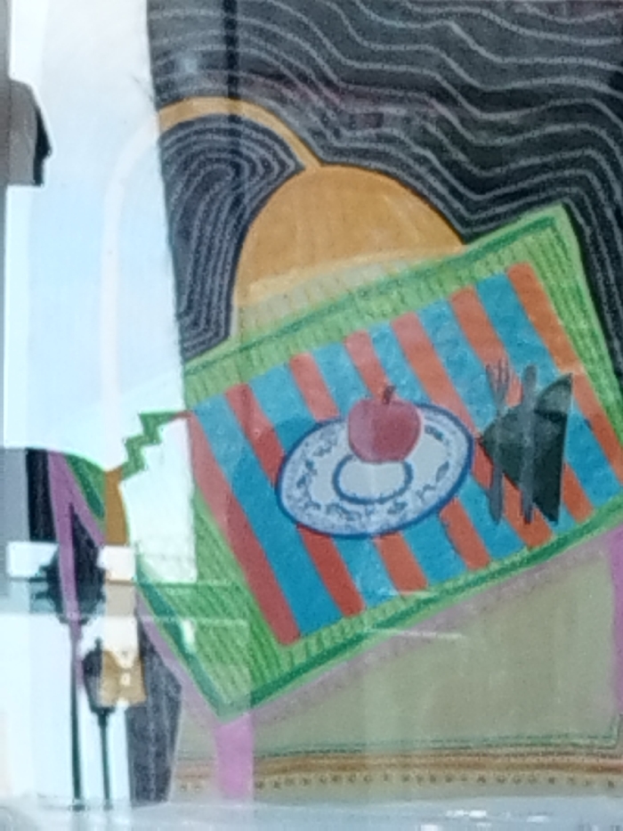 The image displays a stylized artwork, likely a painting or drawing, depicting a still-life arrangement within an interior