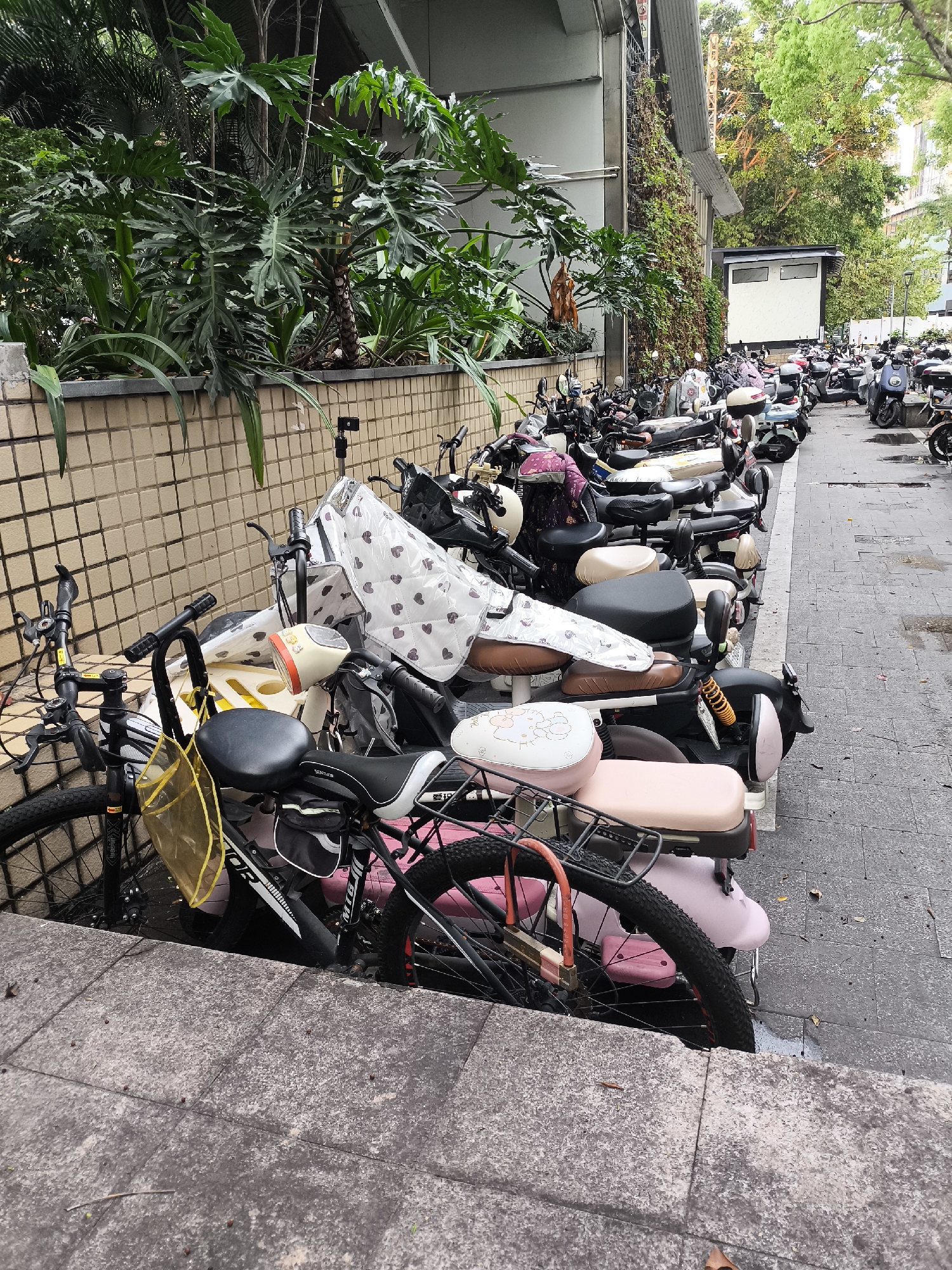 row of parked bicycles and mopeds alongside a building in what appears to be an urban setting. The location is indicated to be in the Longgang District of China. **Environment:** A tiled wall topped with plants runs along the left side of the image. A paved sidewalk runs along the right, with damp or wet spots visible. The background shows more vehicles and trees, suggesting a street scene. **Objects:** * Bicycles and mopeds: A variety of bikes and mopeds are parked in a row, some with covers or accessories. * Building: A building is present behind the bikes and plant-covered wall. * Plants: A variety of leafy plants are growing on top of the wall. **Actions:** Vehicles are parked. **Interactions:** Vehicles are parked next to each other. There are no people visible in the frame.