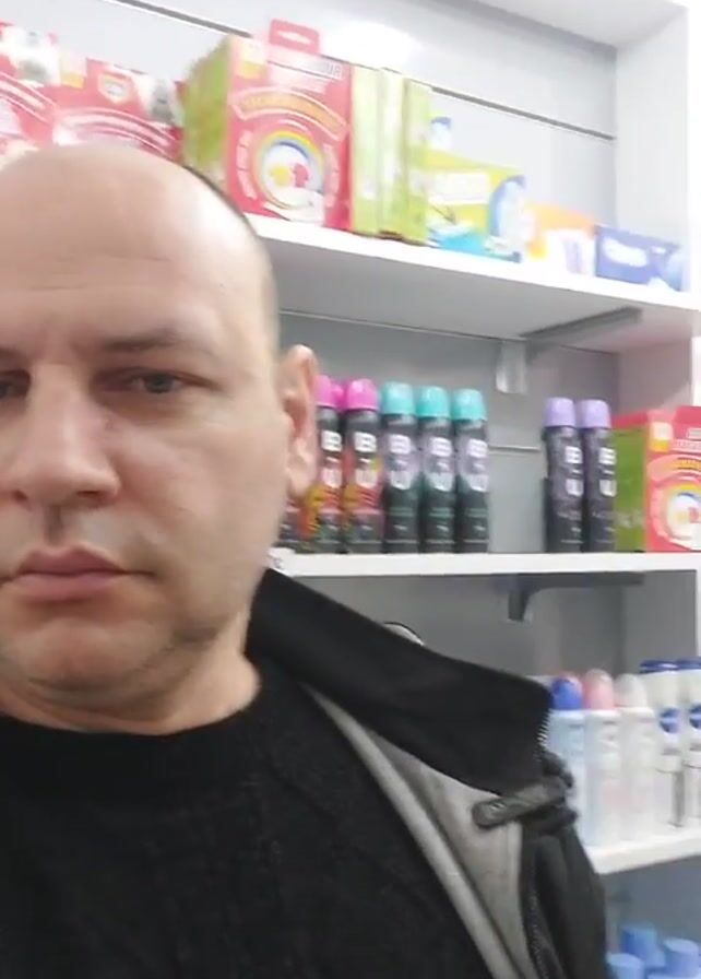 A man stands in front of a shelf in what appears to be a store. He is bald, white, and wearing a black sweater and a gray jacket. He is looking directly at the camera. The shelf behind him is stocked with various toiletries, including deodorant sprays, Nivea products, and paper tissues. Some boxes of children's coloring materials can also be seen on the top shelf. The man slightly moves from side to side, allowing more of the shelf to be seen.
