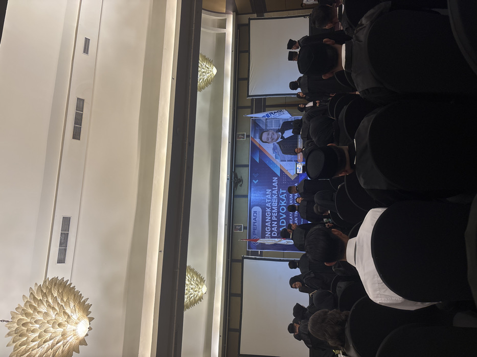 A formal indoor event is captured from a rear perspective, set within a large ballroom or convention hall in Surabaya, Indonesia. The ceiling is high, featuring two prominent, multi-tiered chandeliers with warm light, recessed lighting, and multiple rectangular air conditioning vents. Numerous individuals, primarily adults, are seated in rows of black chairs, facing a stage area at the front. The majority of attendees are dressed in black academic gowns or similar formal attire, with several also wearing black songkok (traditional Indonesian caps). One attendee in the foreground is visible wearing a white collared shirt. At the front of the hall, a prominent blue banner serves as a backdrop, displaying the logo "PERADI" and the Indonesian text "PENGANGKATAN DAN PEMBEKALAN ADVOKAT WILAYAH HUKUM SURABAYA," which translates to "Appointment and Briefing of Advocates for the Legal Region of Surabaya." A large portrait of a smiling man in a dark suit is featured on the right side of this banner. An Indonesian flag stands to the left of the banner, and a white flag with the PERADI logo stands to the right. Two large, blank white projection screens flank the central banner. Several individuals in black gowns are observed standing near the stage. The scene depicts a professional induction or ceremony for advocates (lawyers) in Surabaya.