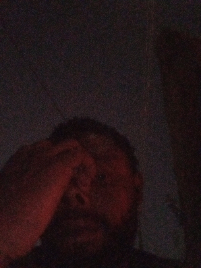 A dimly lit image shows a person with dark hair and a beard, partially obscured by a hand raised to their forehead or eye