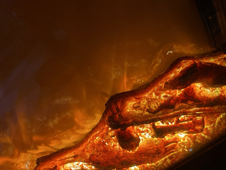 A close-up captures simulated burning logs, glowing with intense orange and yellow light, creating a vibrant and warm atmosphere