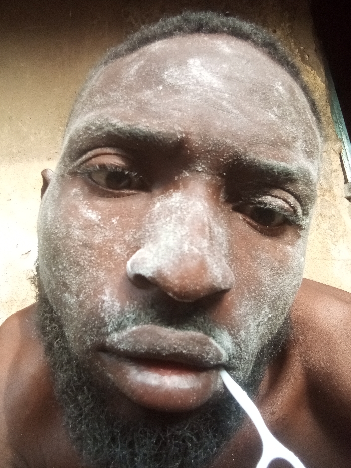 A close-up image of a Black man's face covered in a white, powdery substance. His dark beard contrasts with the white coating. He holds a white plastic dental floss pick in his mouth, positioned between his lips. His eyes are dark and expressive. The background is slightly blurred, suggesting an outdoor setting with a building or wall visible on the right side.
