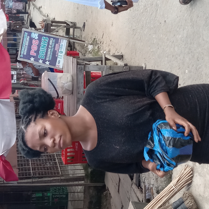 A young Black female stands on a dirt path in ARIDICA, Nigeria, captured from the chest up, facing towards the left of the frame with a neutral expression. She has braided hair styled into two prominent puffs on either side of her head and wears small golden stud earrings. Her attire consists of a dark, long-sleeved top, possibly with a subtle sparkle, and a dark lower garment. She holds a compact object, wrapped in blue and black plastic, in both hands at waist level. The immediate background reveals an outdoor market environment. To the left, bundles of natural-fiber brooms rest on the ground. Directly behind the female are wooden market tables, some supporting red Coca-Cola crates and a clear plastic bucket containing light-colored items, possibly food products. Overhead, red and white striped awnings suggest stall coverings. Further back, a white signboard with blue lettering prominently displays "U-CHEAK INVESTMENT SERVICES AVAILABLE," "POS DRINKS," and "RECHARGING OF MOBILE." Various individuals are partially visible in the background; one person in a patterned shirt stands behind the stalls, and another, wearing a white long-sleeved garment, is partially visible on the right foreground. The ground consists of uneven dirt and concrete sections, with some debris present.