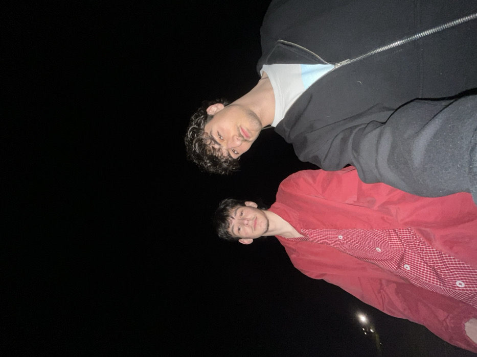 A nighttime photograph captures two young adult males posing for the camera