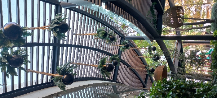 - "Inside an arched structure with vertical slats and a partially transparent ceiling, decorative coconuts hang by ropes" by FM-J1hWQ2, licensed under CC BY 4.0