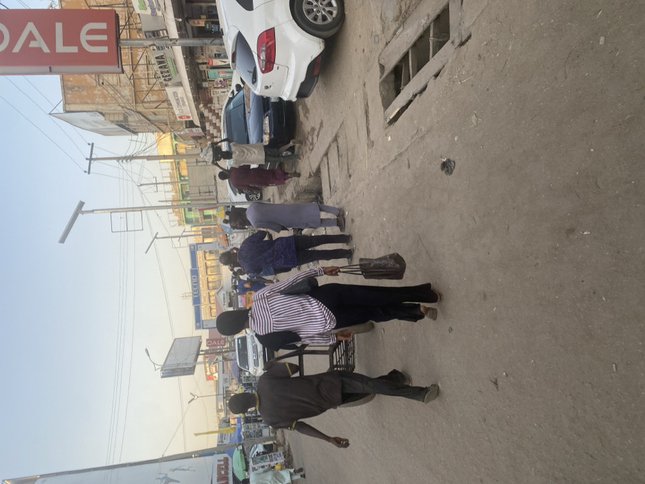 A group of people walk along a city street. A man pushes a cart in the foreground, while others follow behind him. Parked cars line the curb near buildings with storefronts. A few power poles stand alongside the street. The road is gray, and the sky is a pale blue.