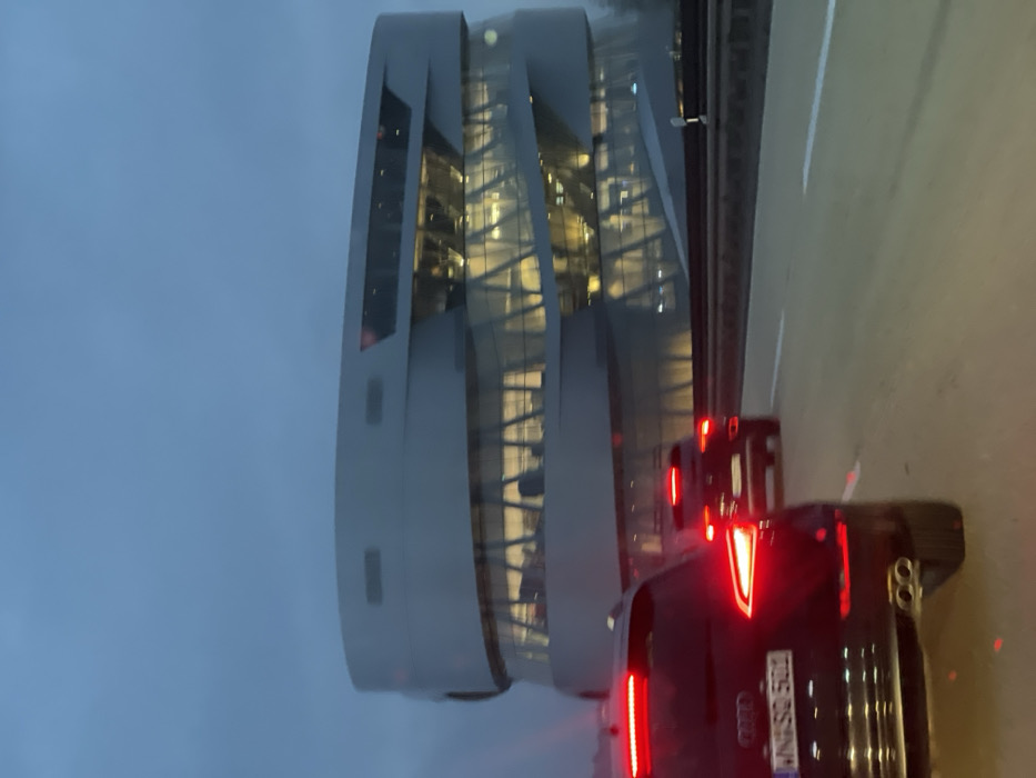 The Mercedes-Benz Museum in Stuttgart, Germany is a striking architectural landmark. The building, a modern, silver structure, is captured from the side, showcasing its multi-level design with many illuminated windows. Two dark-colored Audi vehicles are in the foreground, with the lead car's tail lights clearly visible. The sky is overcast, suggesting either dusk or a cloudy day. The setting implies a street adjacent to the museum.