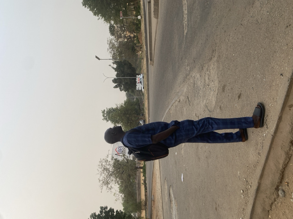 An adult man is standing on the side of a road. He is wearing a patterned blue shirt, blue pants, and dark sandals. He has a dark backpack over his shoulder. The road is paved and there are trees and a few buildings visible in the background. The sky is hazy and overcast. A large billboard is seen in the distance.