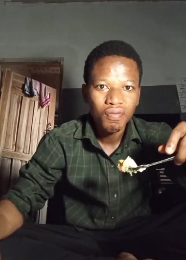 A young man is sitting cross-legged in a dimly lit room, wearing a dark green plaid shirt and black pants. He's holding a fork with food on it, eating it, and then reacts with shock, opening his mouth wide and grabbing his head. There is a plate of food next to him on the floor, covered in a plastic bag. Behind him is a wooden door slightly ajar with some clothes hanging on it. The ceiling is a light grey.