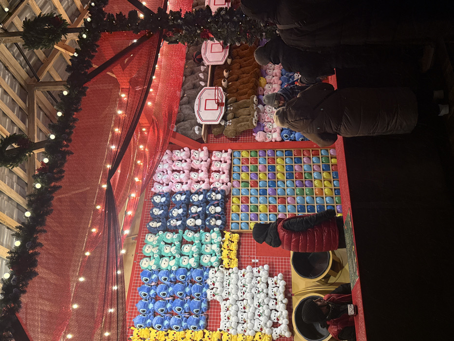 The image depicts a nighttime scene at a carnival-style game stall, likely part of a Christmas market in Kyiv, Ukraine