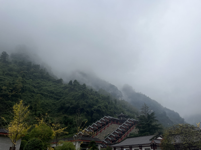 A landscape under heavy fog features a verdant, tree-covered hillside. A dark structure with tiered levels and a red railing ascends the slope, resembling a long staircase. The sky is uniformly grey, and low-hanging clouds obscure the upper reaches of the mountain. Some buildings are visible near the base of the mountain, partially obscured by trees. The lighting is soft and diffused.