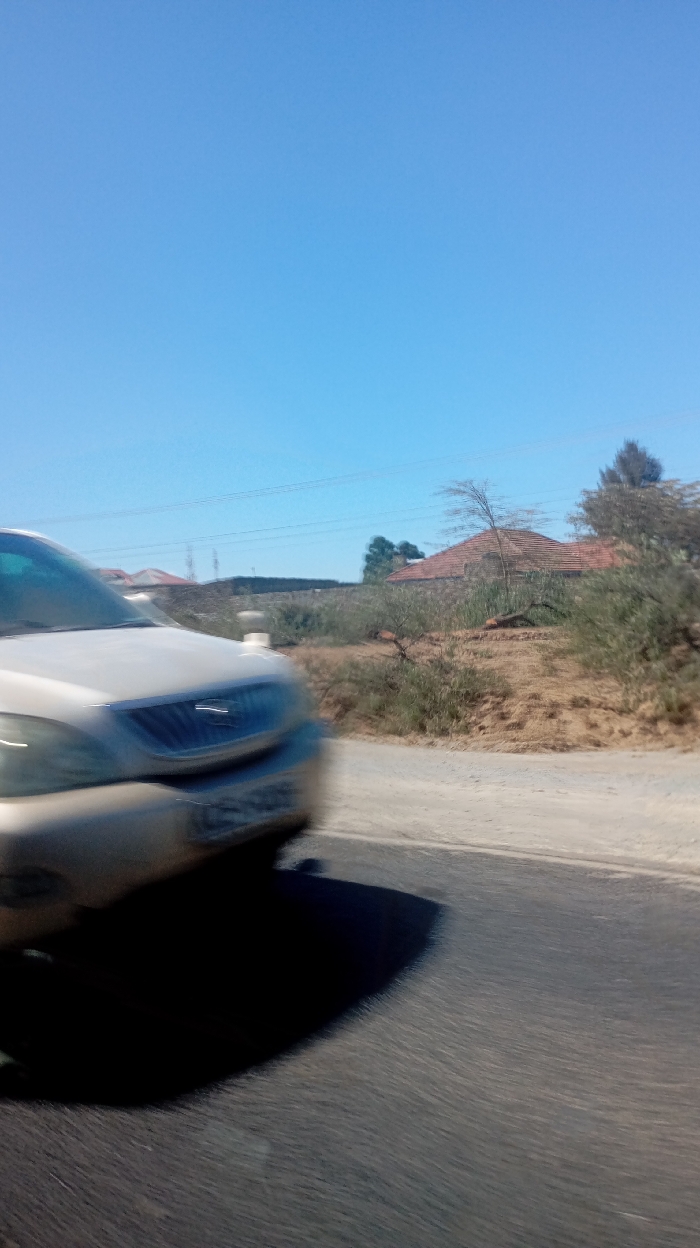 A blurry image shows a silver-beige car moving quickly along a dark asphalt road. The sky is a clear, bright blue. A grassy verge with small bushes and trees runs alongside the road. In the background, a house with a red tile roof can be seen. Power lines are visible above the bushes. The car's shadow is large and dark, stretching across the road.