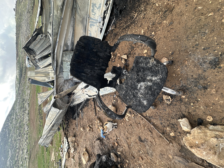 This image captures the aftermath of a fire in an outdoor, semi-arid environment in Mikhmas Bedouin, Palestinian Territory