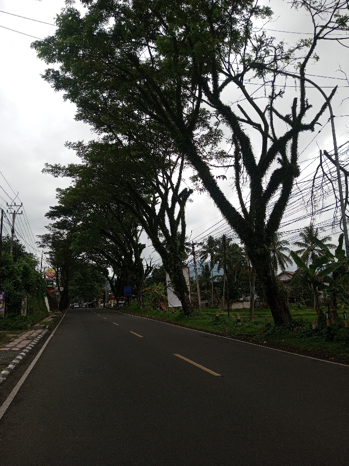 The image presents a two-lane asphalt road in Kodarapalli, India, extending under an overcast sky. The road features faded double yellow centerlines and a single yellow line on the right, leading towards distant vehicles. On the left, a paved sidewalk with black and white striped curbs borders a vegetated bank, behind which a row of large, leafy trees forms a partial canopy. A red and yellow sign is visible on the left in the mid-ground. Power poles with numerous overhead lines are present on both sides of the road. On the right, a grassy verge precedes several mature trees whose trunks and branches are heavily covered in moss or epiphytes. Beyond these, palm trees, banana plants, and a light-colored building are visible. Distant mountains or hills are faintly discernable under the cloudy sky. No individuals or specific actions are observed in the immediate foreground.
