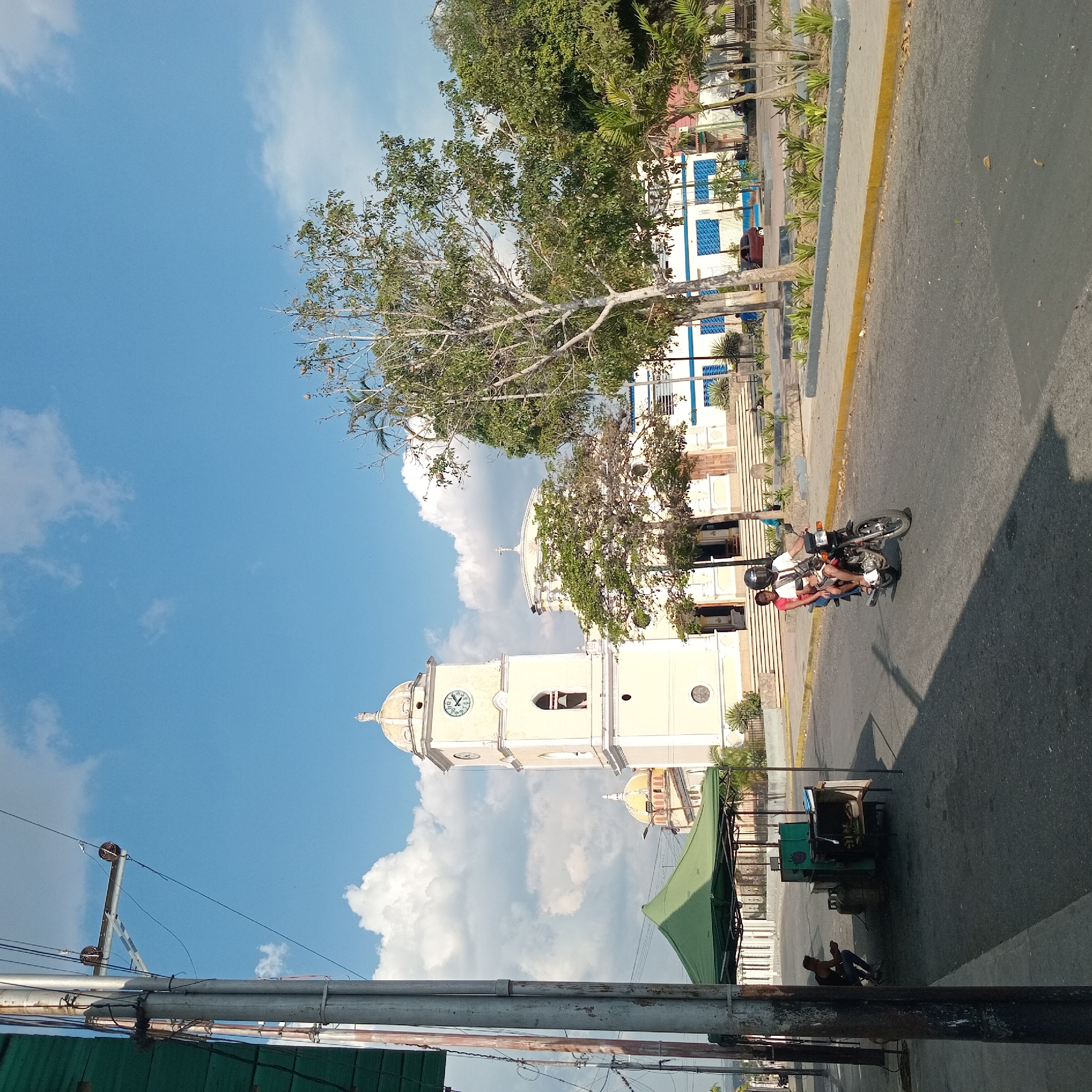 street scene in Duaca, Venezuela. A light-yellow clock tower with a dome and a visible clock face stands prominently in the background, partially obscured by a tree. The sky is blue with scattered clouds. In the foreground, a motorcycle with two riders is on the street. The road has a light-colored curb. A building with white walls and blue-trimmed windows is visible adjacent to the tower. An outdoor vending stall with a green awning stands near the bottom of the frame. A person is sitting on the ground near the stall. Utility poles and wires are present in the lower left corner.