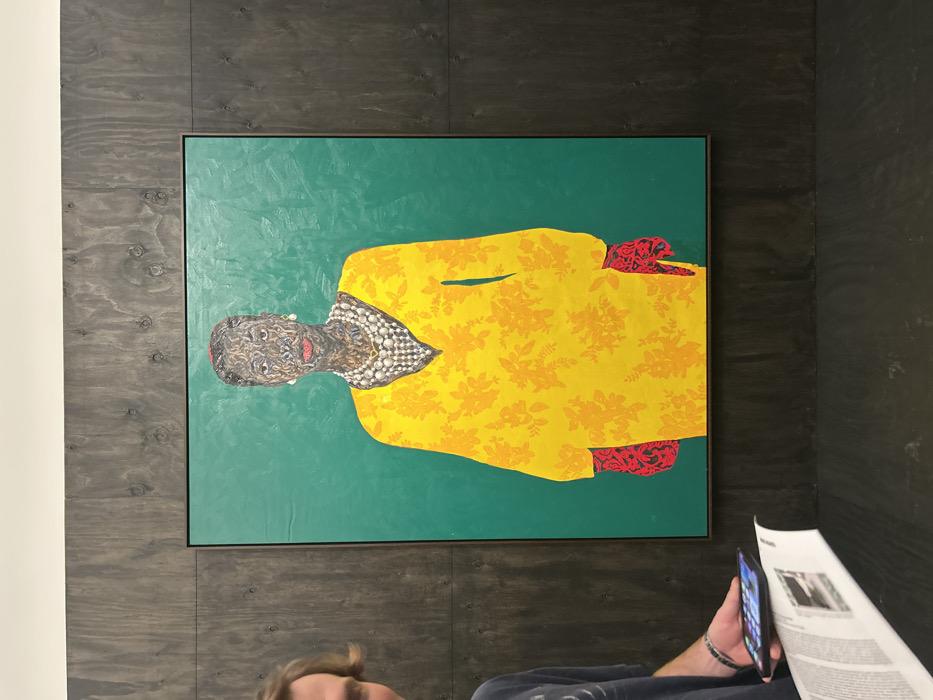 An abstract painting in a dark frame shows a person with grey hair wearing a string of white pearls and a yellow patterned coat with red accents